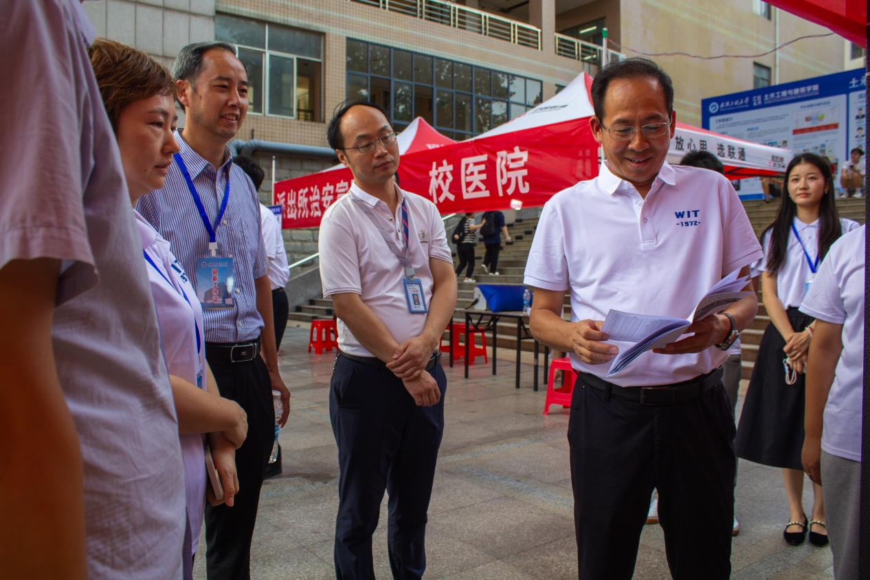 校党委常委,副校长马小龙亲自到迎新现场指导并慰问了新生及家长,深入了解了迎新工作的进展情况。他询问了学院的报到情况,同时对志愿者的辛勤付出表示高度肯定。在翻阅学院“毕业生风采录”时马校长强调,“学校不仅要关注新生进入学校时的质量,更要关注经过学校四年培养后毕业时的质量”。