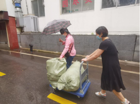 安全工程专业吴燕玲老师和班主任邱丹丹老师冒雨为毕业生搬运行李