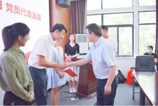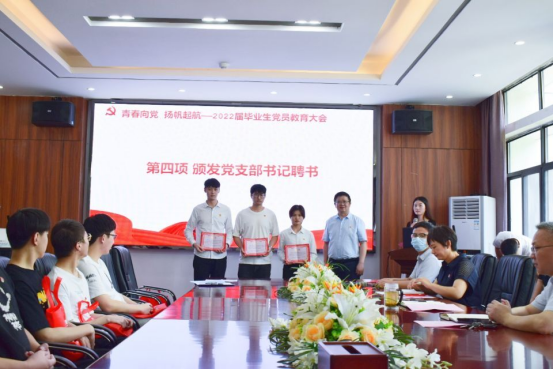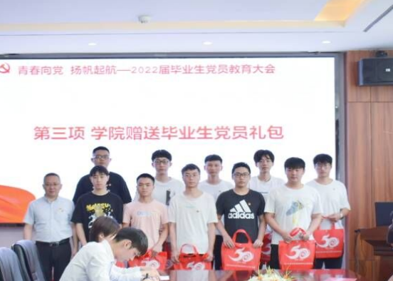 会上,全体毕业生党员共庆政治生日,重温入党誓词,学院党委书记路海华为庆生党员代表送上政治生日贺卡、为毕业班党支部书记颁发荣誉证书,院长何东升、院党委副书记李佳为毕业生党员一一发放党员纪念礼包。