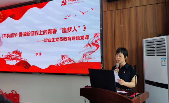 李佳以《不负韶华勇做新征程上的青春“追梦人”》为题,为2022届毕业生党员讲授在校最后一节党课。她勉励毕业生党员在人生新征程上,要坚定“革命理想高于天”的崇高信念、树牢“三更灯火五更鸡”的勤奋之姿、践行“打铁还需自身硬”的庄严承诺、永葆“而今迈步从头越”的鸿鹄之志,努力做到以学促知、以知促行、以行践知,找准人生坐标,升华人生价值,将青春挥洒在实验室、企业车间和基层广袤的大地上。