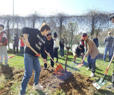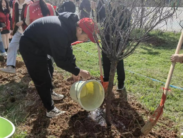 植树现场,大家干劲十足,在校党委书记程幼金、校党委副书记李志旭的带领下,以学院为单位投入到紧张的劳动中,扶苗固根、挥锹填土,提水浇灌……大家相互协作、默契配合,认真细致地完成每一道工序。