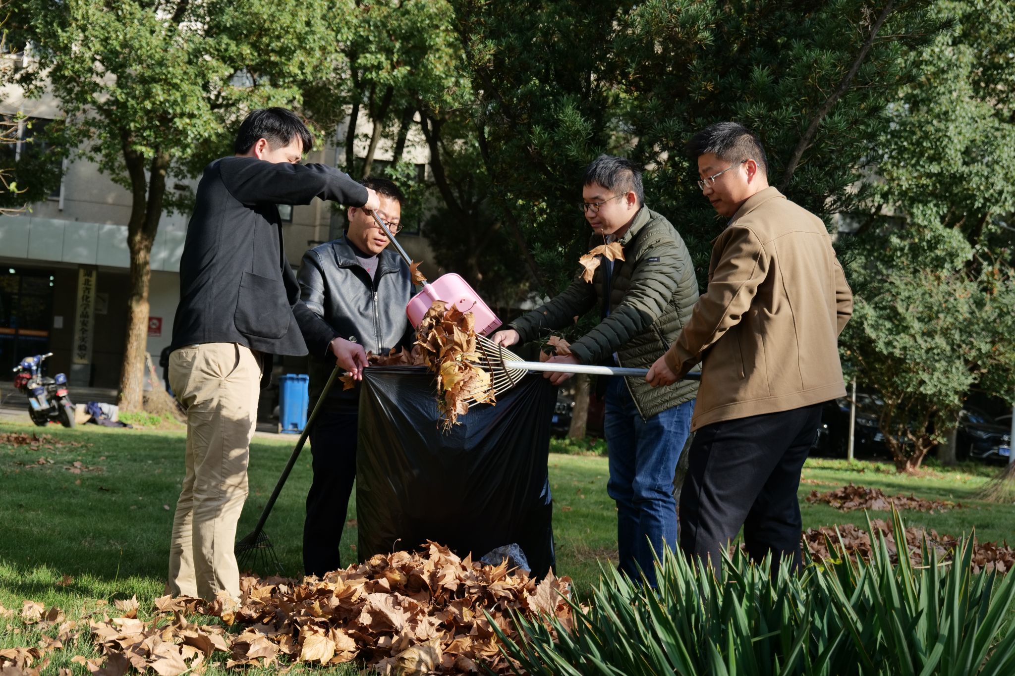 党员志愿者们充分发挥不怕脏、不怕累的精神,分工配合对学院劳动责任区域内进行清扫,手拿草耙子、垃圾袋,对许志伟广场的落叶枯枝、纸屑烟头等垃圾进行清扫装袋。