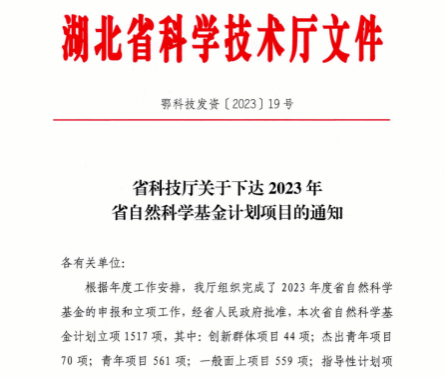 (通讯员:郭文达)近日,湖北省科学技术厅下达了2023年省自然科学基金计划项目的立项通知,草榴社区