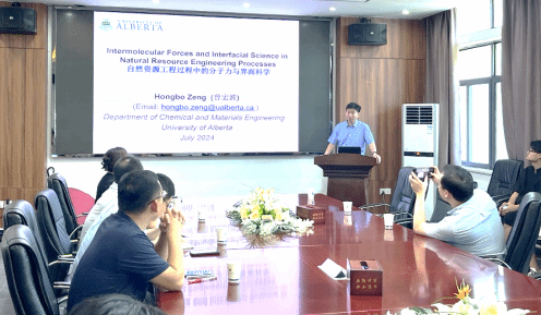 报告中,曾宏波详细介绍了矿产资源、环境工程、化工和生物化工过程中分子力与界面现象的机理,并通过生动的案例展示了这些科学原理在矿物浮选、冶金工程、尾矿综合利用、软物质材料、自修复材料、自清洁材料、油水分离、电池粘结剂、可穿戴电子器件等功能材料开发中的重要作用。他还同青年教师及同学们交流了分解科学问题并建立可行的研究方法,希望大家能高效开展学术研究。在师生提问环节,曾教授耐心解答了各类学术问题,介绍了阿尔伯塔大学科研底蕴、平台和学科优势,以及前往该校访学交流的要求和途径,并邀请我校师生前往交流学习。