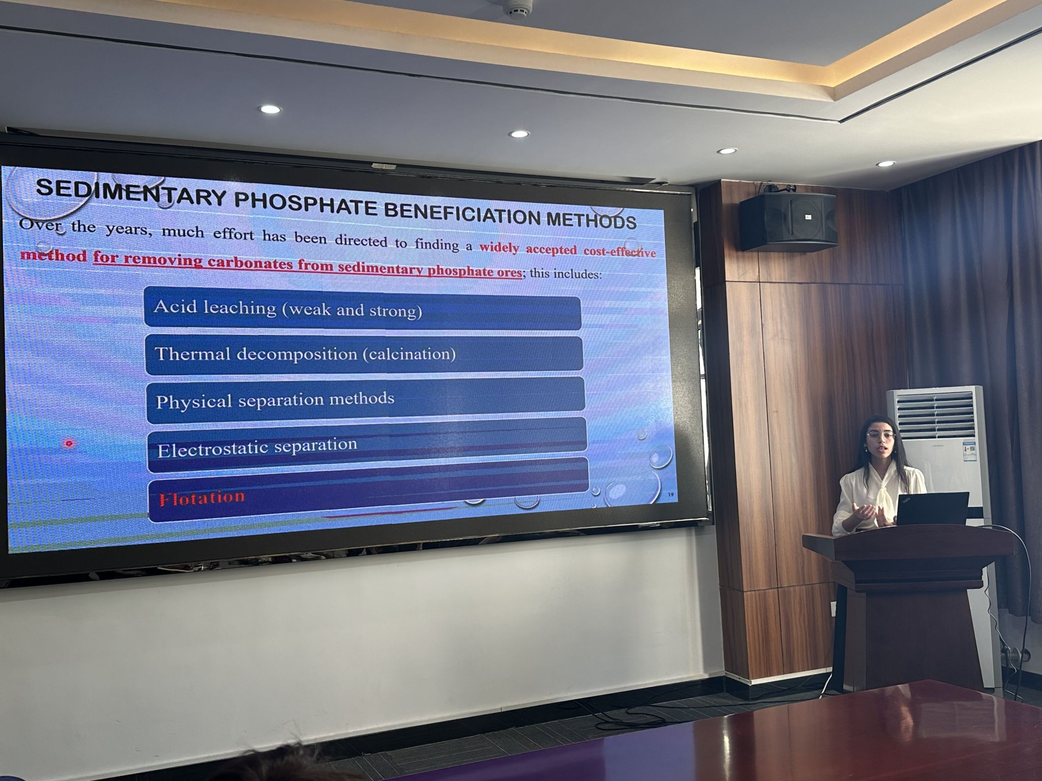 Aarab Imane教授做了题为《The challenging direct flotation of low-grade phosphate ores》的报告,从不同磷矿浮选策略、不同浮选药剂的作用机理以及低品位磷矿浮选所遇到的挑战等方面进行了汇报。