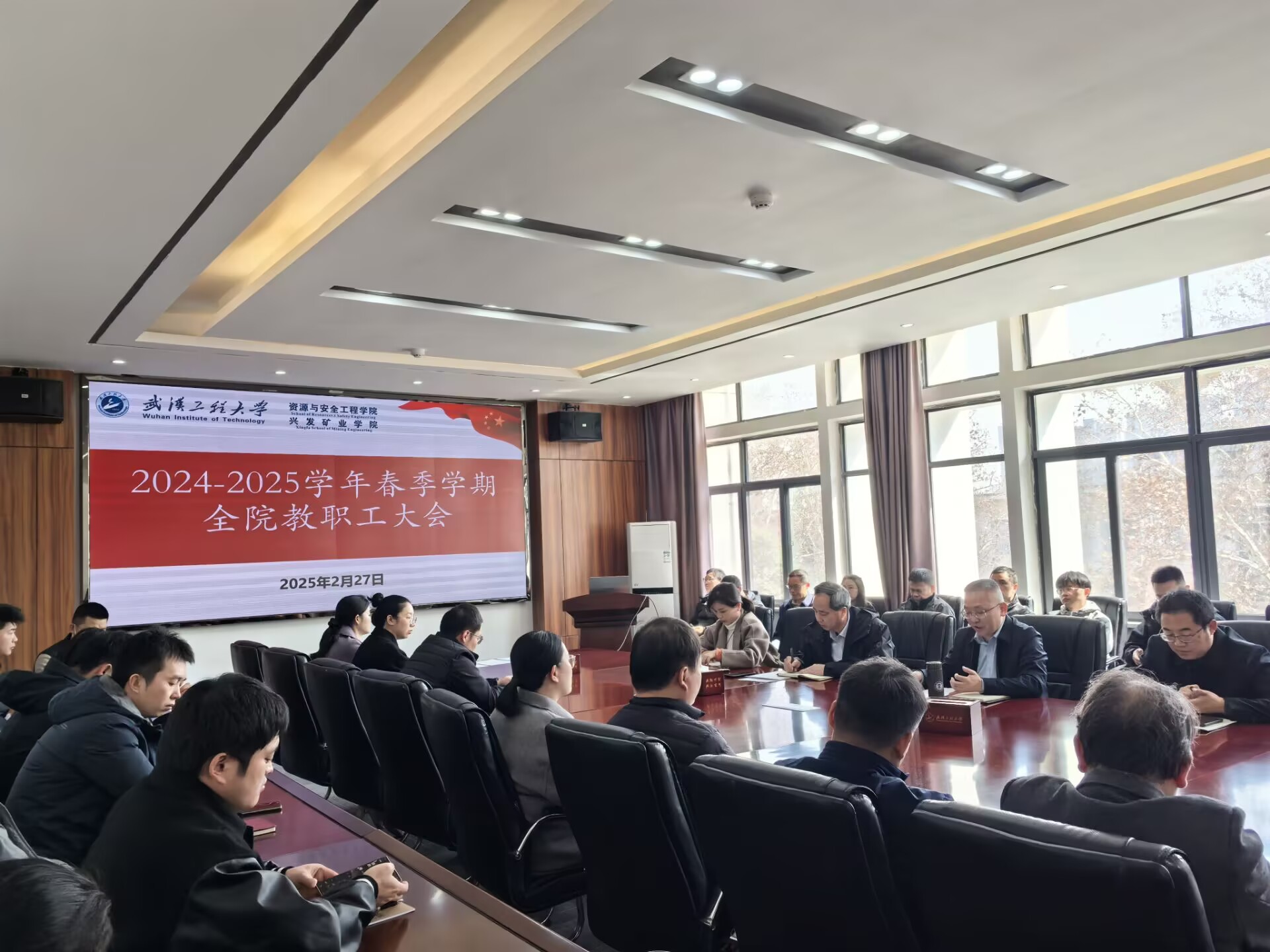 在419会议室召开2024-2025学年春季学期全院教职工大会,学院领导班子及全院教职员工参加,会议由院党委书记江本武主持。