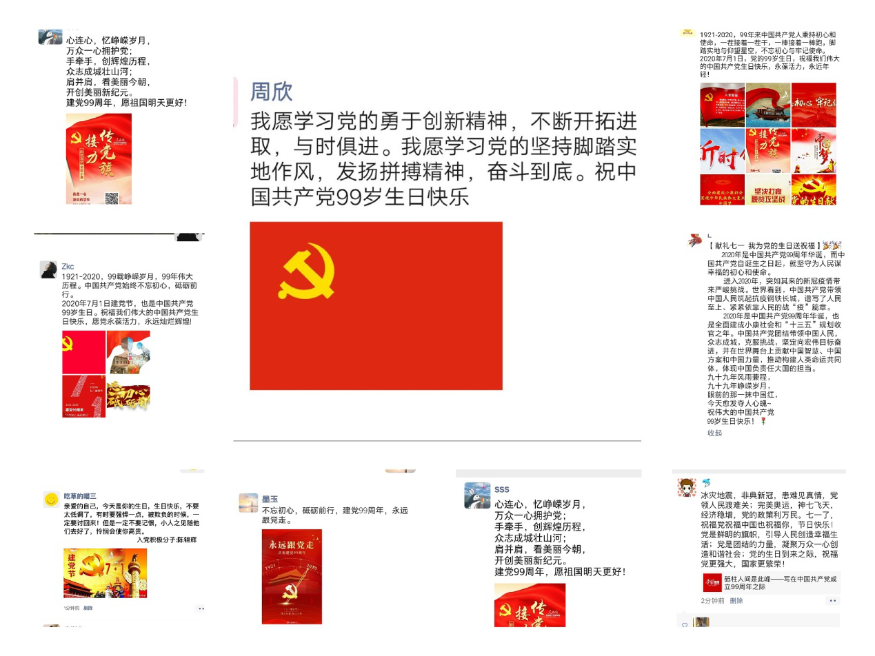 2020年7月1日是中国共产党成立99周年纪念日,草榴社区 全体学生党员开展了以“我为党的生日送祝福”为主题活动。活动共征集来自基层党支部、入党积极分子的微信朋友圈和手写祝福短语等形式作品178篇。