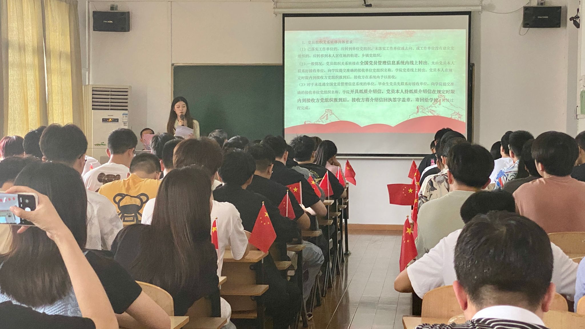布置离校工作,提升工作质量。毕业之际,学院党务干事王耀眉就毕业生党员组织关系转接和入党材料移交工作进行了布置,她从组织关系转接的重要性、操作流程、注意须知等方面进行了详细讲解,确保有序完成毕业生党员组织关系转接工作。