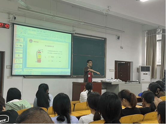 保卫处消防管理科科长毛晓晋向大家介绍近年来高校校园内火灾发生的情况,指出了校园学生日常生活和学习中容易引发火灾的不当行为,并现场演示了灭火器的使用方法和注意事项,有效提高了学生的应急应变能力。