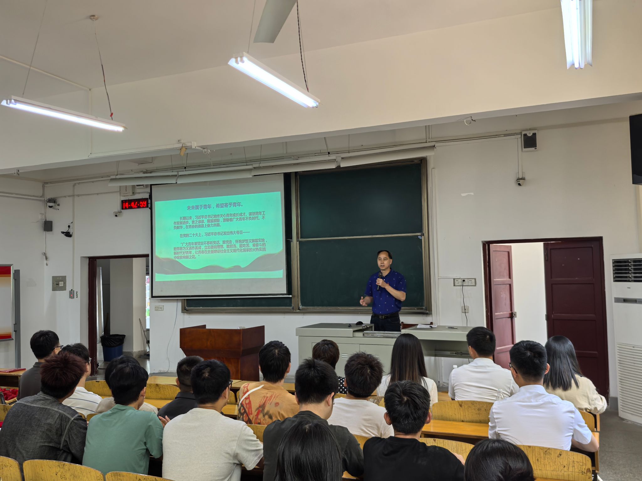 学院党委书记江本武为学生党支部副书记颁发聘书和纪念礼,并为全体毕业生党员讲授题为《听党话、跟党走,让青春在实践中绽放绚丽之花》的专题党课,教育党员要坚定不移听党话、跟党走,争做有理想、敢担当、能吃苦、肯奋斗的新时代好青年。