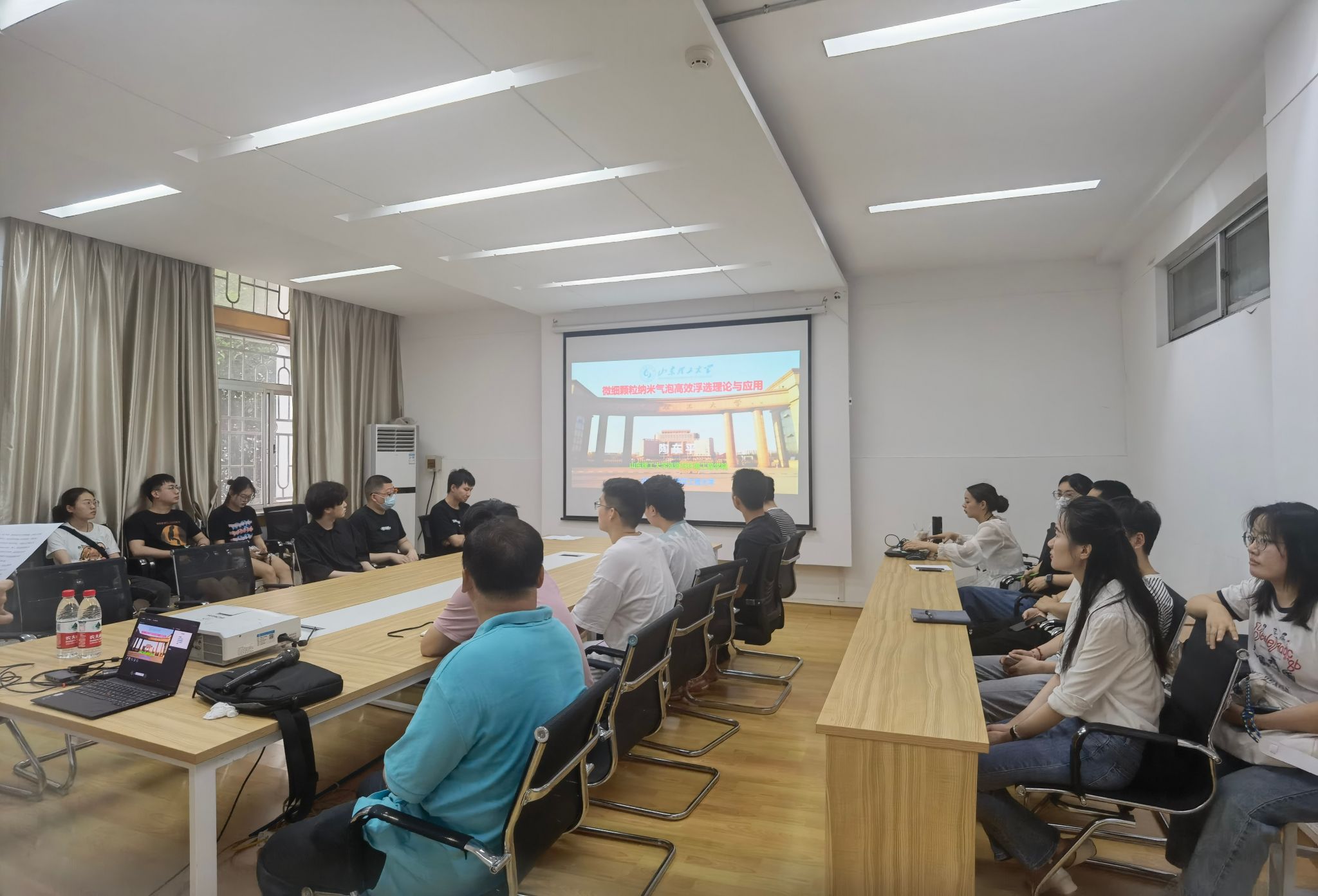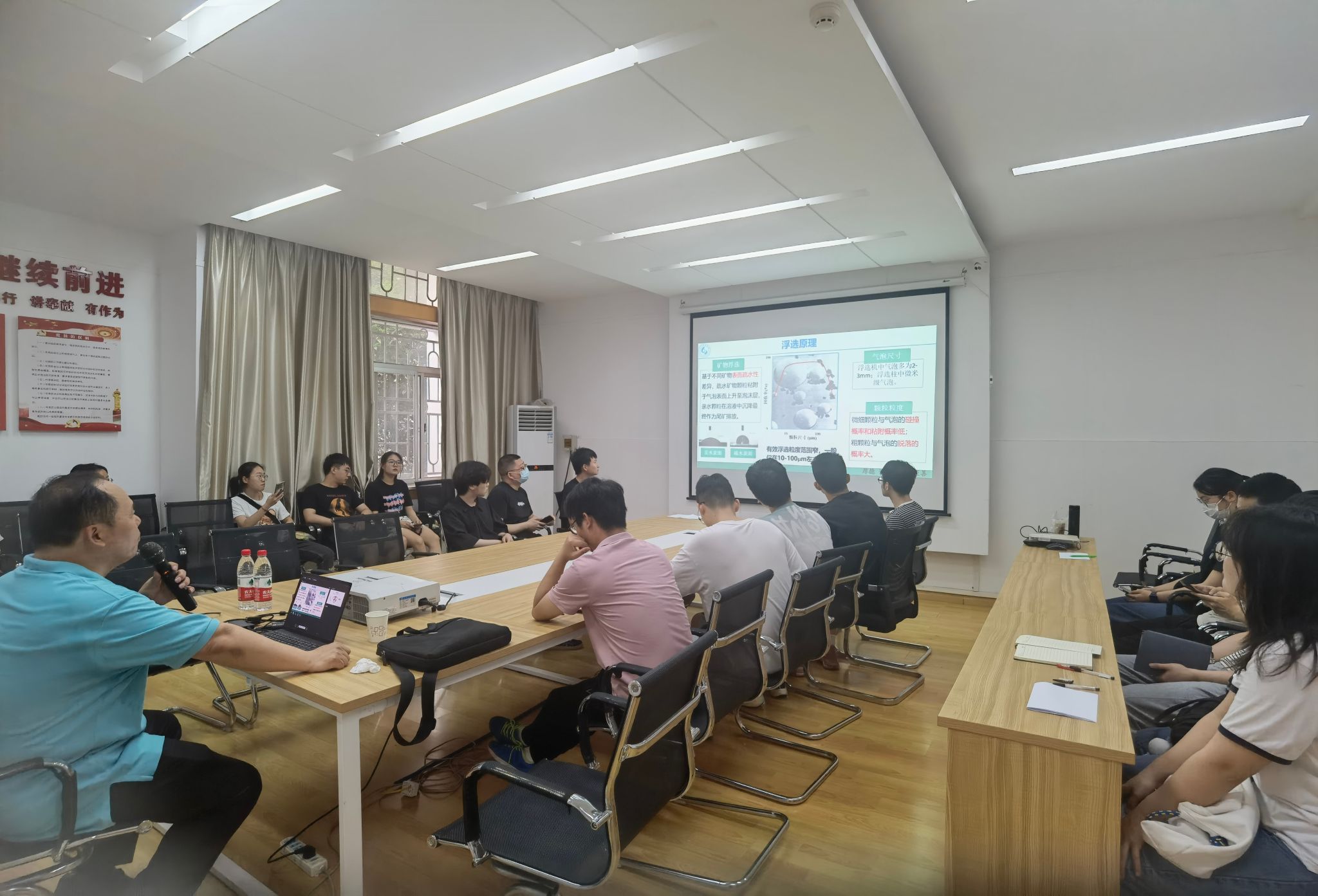 陶教授此次报告深入浅出的介绍了矿物浮选的原理,同时指出传统浮选技术的缺陷。比如:传统浮选机内部搅拌强烈,气泡尺寸大至2.3mm,有效浮选粒度范围窄等问题。 介绍了纳米气泡特性表征:用直观明了的图表表现纳米气泡的尺寸、浓度、Zeta电位等特性表征及 纳米气泡浮选理论。当今社会中纳米气泡浮选应用,目前纳米气泡浮选技术在相关企业的应用情况。纳米气泡生成机理独特,比常规气泡降低气泡剂用量三分之一以上等精彩内容。为研究生开展选矿技术与基础理论提供了研究思路和宝贵经验。在交流互动环节中,与会师生就报告内容纷纷向陶教授提问,报告在轻松愉快的氛围中圆满结束。
