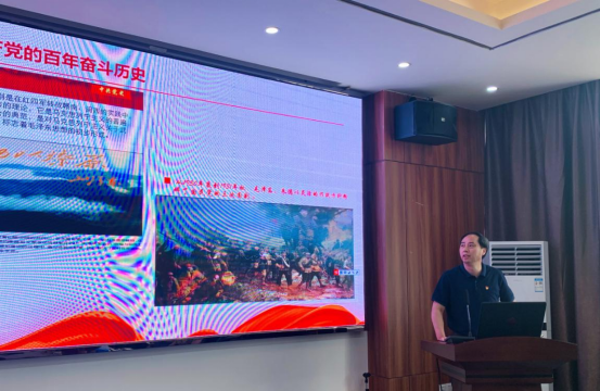 并就我们从党史中学什么,我们怎么学好党史展开讲授。我们学习党史,要明确一个最根本的问题,即中国共产党从哪里来、到哪里去,初心和使命是什么;中国共产党历史的主流和本质是什么;中国共产党带领全国人民创造的根本成就是什么。我们要坚持以史为鉴,从党的百年伟大奋斗历程中,学史明理、学史增信、学史崇德、学史力行,以党史洗涤心灵之尘、以党史激发奋进之力。