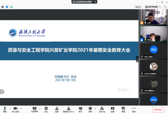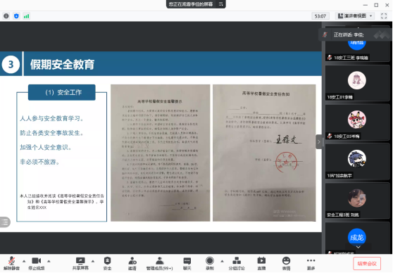 李佳宣讲了2021年暑假的相关通知及规定,讲解了学院关于开展“学习习近平总书记在庆祝中国共产党成立100周年大会上的重要讲话精神”和2021年大学生志愿者暑期文化科技卫生“三下乡”社会实践活动相关要求,结合学校下发的《高等学校暑假安全责任告知书》集中开展了人身安全、消防安全、实验室安全、防网络、电信诈骗、防意外伤害、防溺水等方面的教育,并针对本科生和研究生的不同层次、不同年级的学业政策、日常管理规定做了一一的解读。
