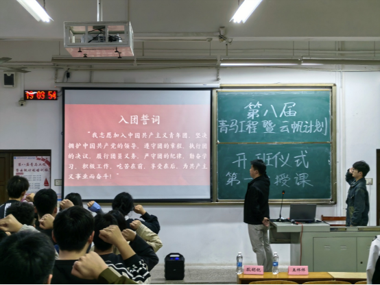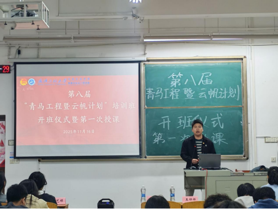 第八届“青马工程暨云帆计划”培训班开班仪式及第一次授课在武昌校区W2201教室顺利举行。团委指导老师耿胡锐、学生团委副书记王艺樨、主席团成员,2024级班长与团支书以及2025级全体成员参加了此次活动。