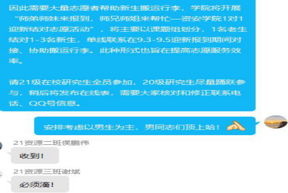 9月2日,学院发布了“老生结对志愿者”活动,在校学生党员、青年志愿者和学子们积极响应,踊跃报名,不到2个小时,学院261名新生被志愿者们“抢购”一空。结对以课题组、班级为单位,新老生通过双向互选,最终实现新生100%精准结对服务。