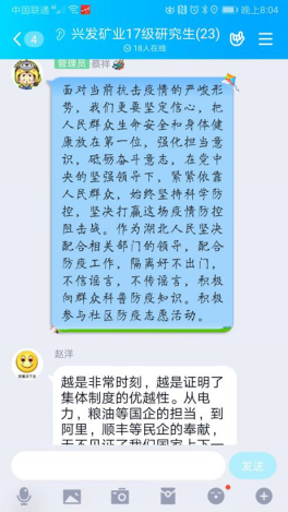 从2月中下旬开始,学院学生工作办公室全体人员通过网络平台积极引导学生配合学校疫情防控工作的要求,深入班级,真实全面的了解学生最新动态、给学生近距离的关心关怀。学院团委负责人孙奕老师及时关注班级学生动态,严格落实学生情况实行日报打卡制度。毕业班辅导员杜娟老师积极引导学生关注线上就业和考研调剂信息发布,做到疫情防控与考研就业“两手抓,两不误”。