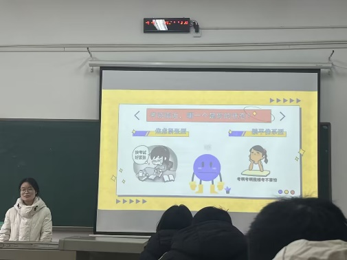 班会的最后,心理委员们还特别强调了保持积极心态的重要性,提醒大家合理安排复习时间,避免过度疲劳,并且给出缓解焦虑的几个小方法,维持身心平衡。同时,也重申了诚信考试的原则,倡导每位同学做诚实守信的文明大学生。